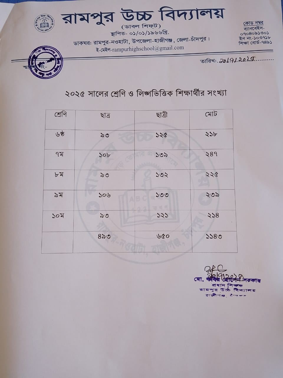 বিদ্যালয়ের লিঙ্গ ভিত্তিক শ্রেণী শিক্ষার্থীদের তথ্য ২০২৫